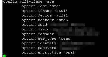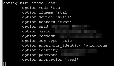I tried connecting from the UI and then when back to check vi /etc/config/wireless to see if it had changed. and it changed eap_type ‘ttls’ to ‘peap’ and removed anonymous_identity 'anonymous'