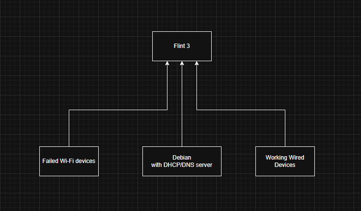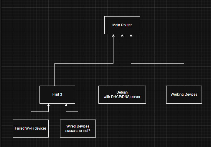 BE9300 as the primary router (DHCP/DNS disabled), with a Debian device providing DHCP/DNS within the same subnet.