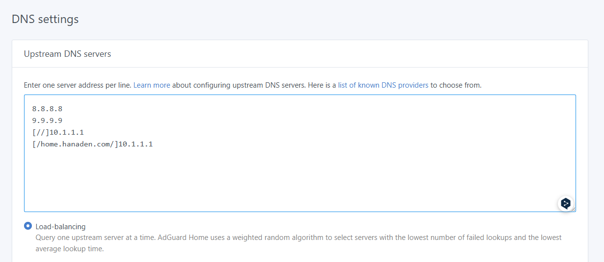 - Or explicitly define upstream DNS servers in AdGuard Home → Upstream DNS servers, such as: