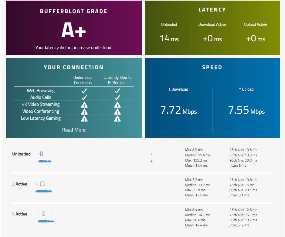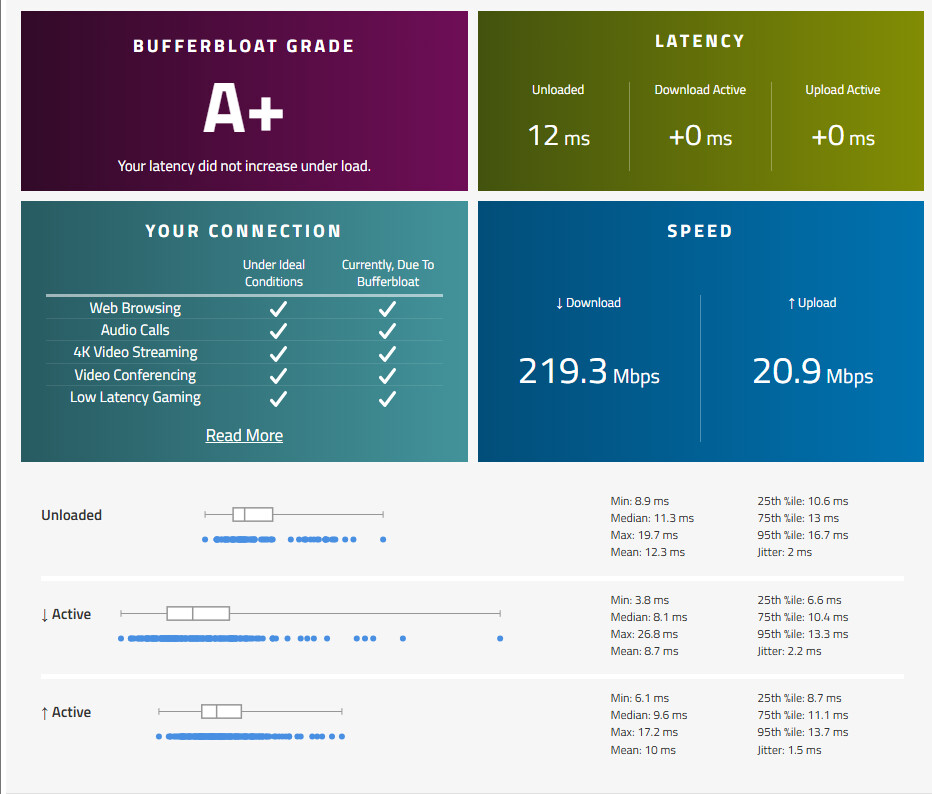 The Problem: I get a consistent 'C' grade on the Waveform bufferbloat test with over +140ms of added latency during uploads, making real-time applications unusable.