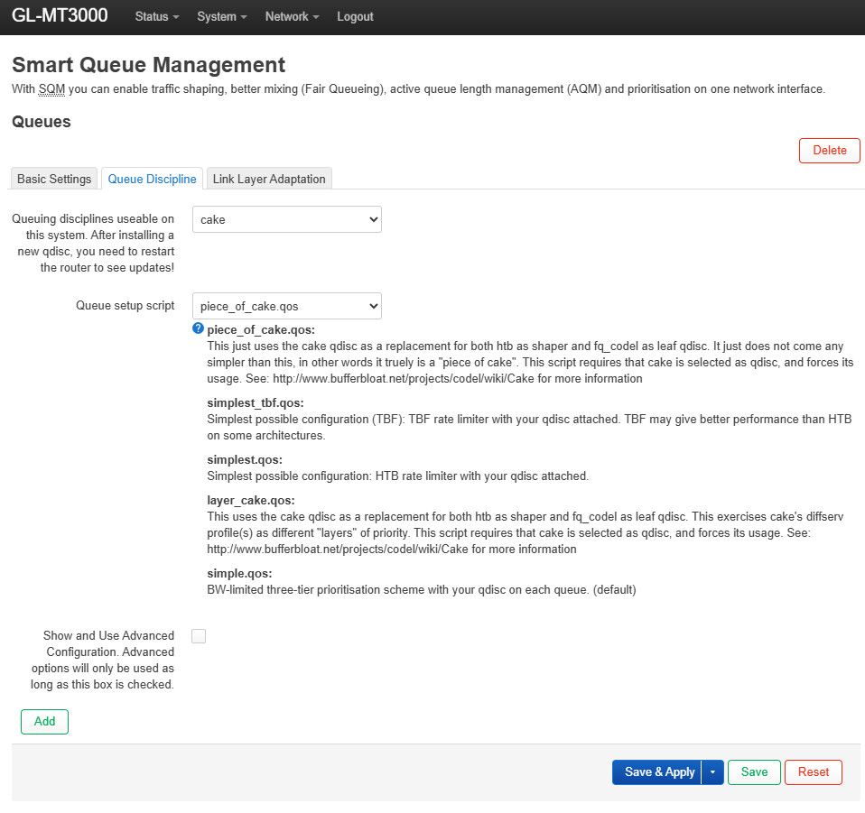 I'm hoping to get some advice or see if anyone else has run into a stubborn issue with my GL-MT3000. I'm experiencing severe upload bufferbloat, and despite extensive troubleshooting, I cannot get SQM QoS to have any effect on the connection.