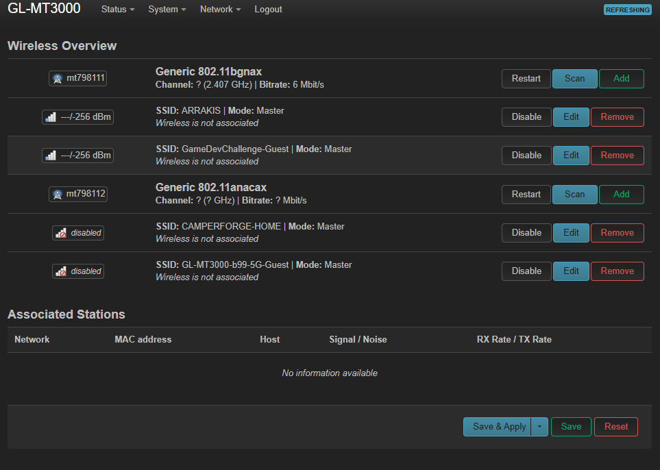 After a power outage, my GL-MT3000 stopped showing the Wi-Fi networks that were previously configured. I accessed the LuCI web interface to check the settings, but they appear as “Wireless is not associated.” I updated the firmware to the latest version, but it did not solve the problem.