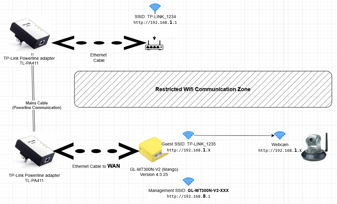 To help overcome this issue and allow me to connect to the Webcam, I have TP-Link powerline adapters and a GL-MT300N-V2.