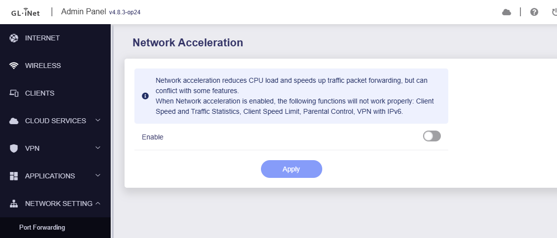 State Mismatch: Even if I change the UCI config, the GL.iNet Admin Panel still shows "Network Acceleration" as Enabled.