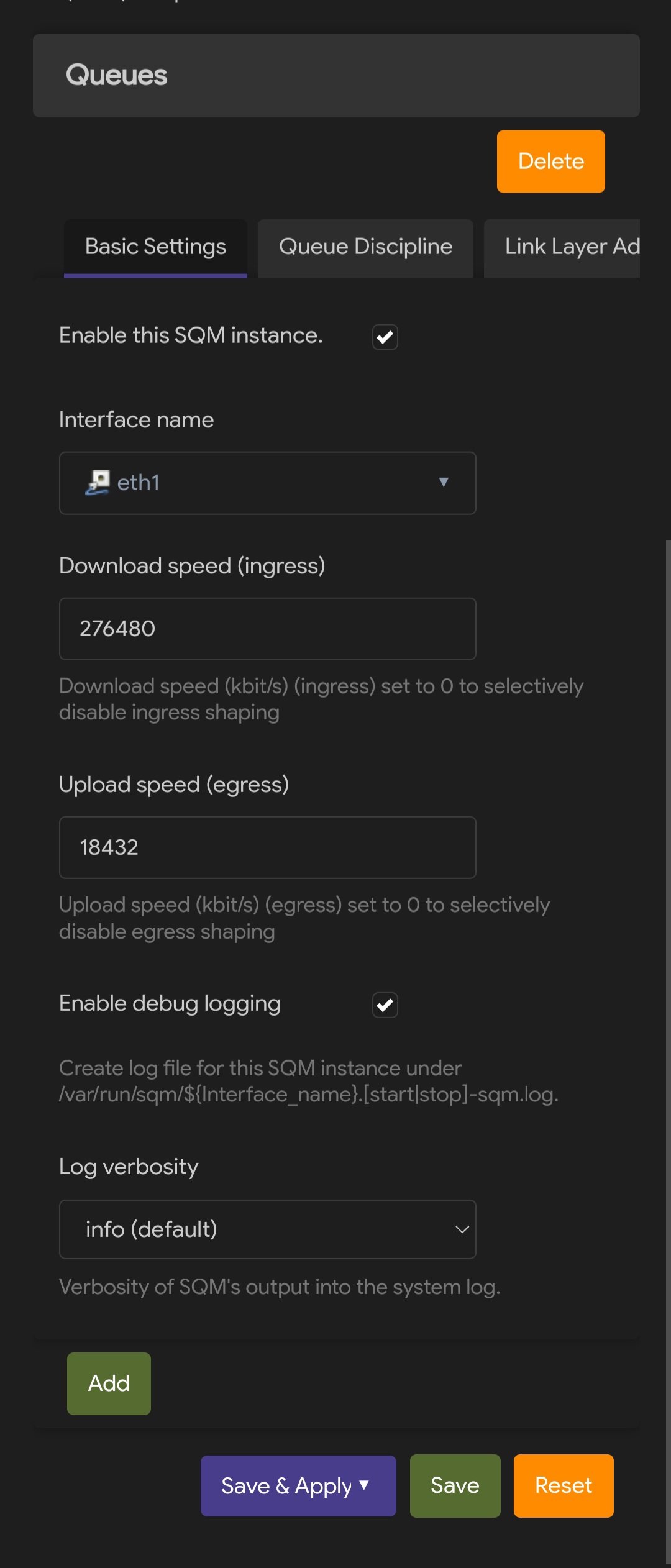 4. Go to the luci sqm interface, select eth0 and enable sqm