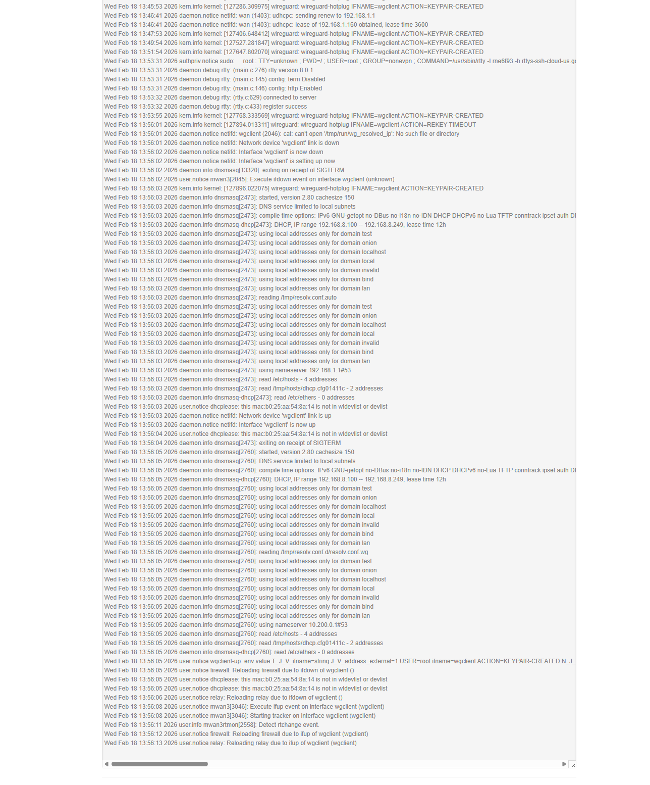 Mon Mar 2 19:30:25 2026 kern.info kernel: [16309.634830] wireguard: wireguard-hotplug IFNAME=wgclient ACTION=KEYPAIR-CREATED