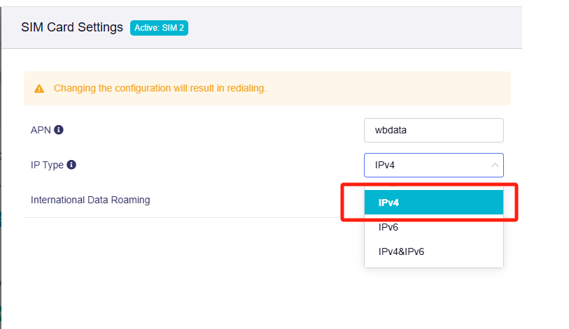 To address this, we recommend the following solution: Manually adjust the connection settings to select "IPv4 only" mode, then verify if this resolves the SIM card registration problem.