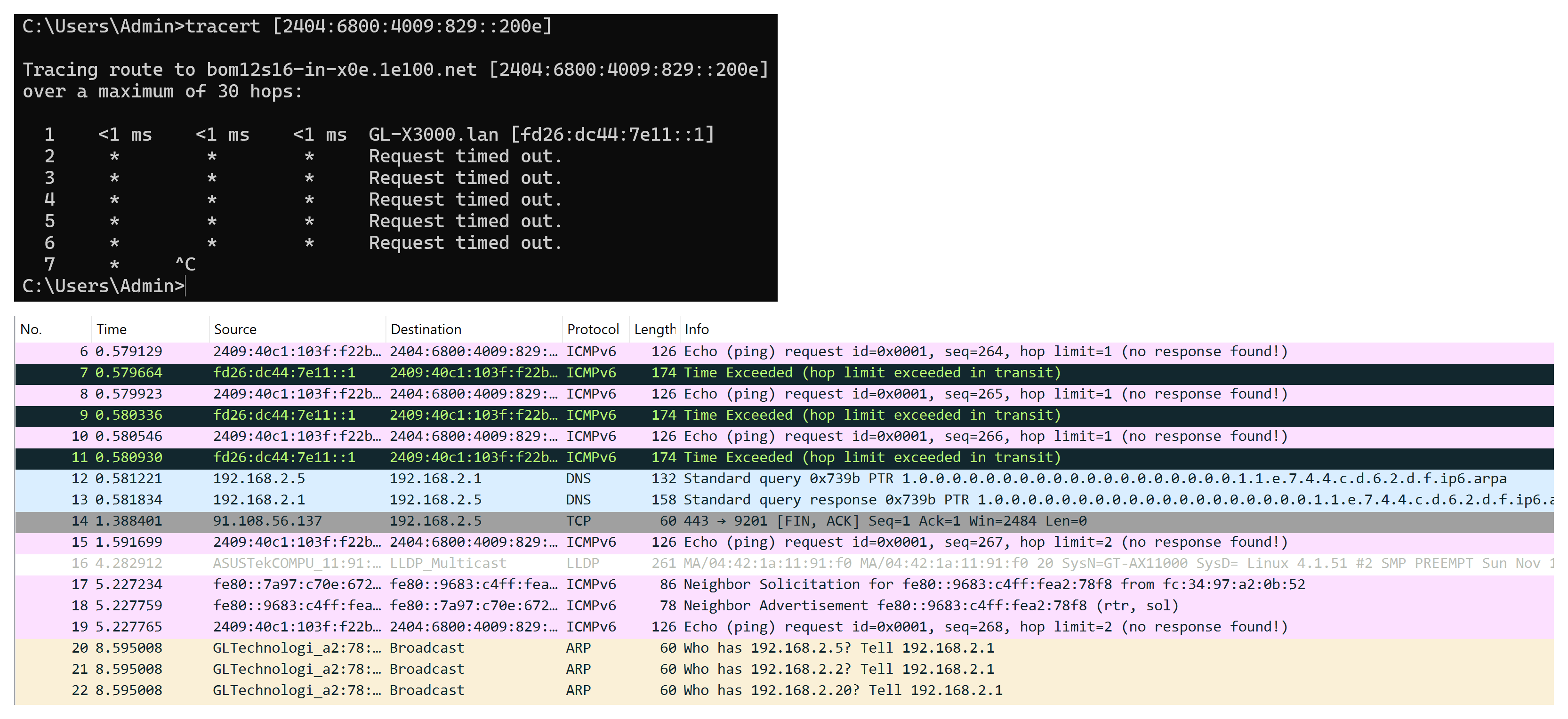 When run tracert [2404:6800:4009:829::200e] (google .com’s ipv6) on window command prompt get bellow wireshark log.