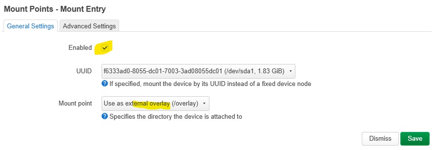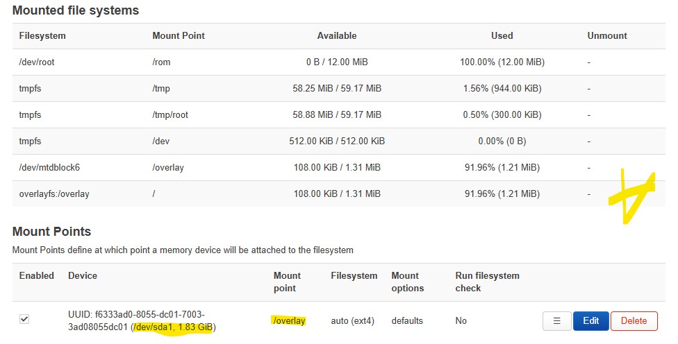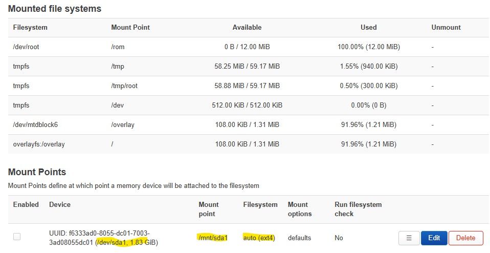 Everything is then displayed correctly under Mount Points. After "Save & Apply," however, this mount point doesn't appear in the Mounted file systems.