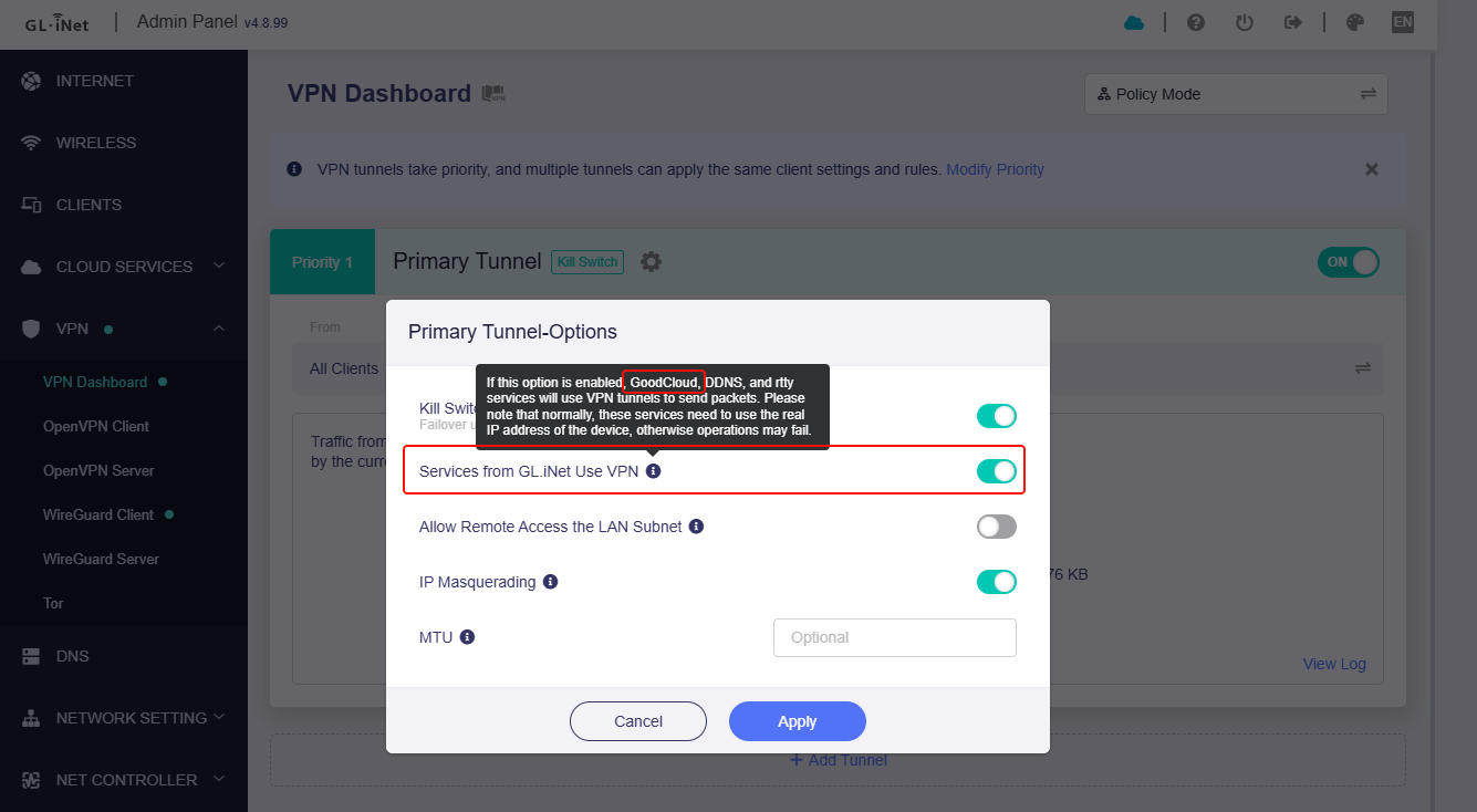 Now that the background is out of the way - Is there a way for me to just send the GLI service connections through a commercial VPN? I’ve got PIA but I really don’t want to deal with sending EVERYTHING through it. I really want to be able to update services without having to resort to connecting the router to my phone hotspot and be able to manage via GoodCloud.