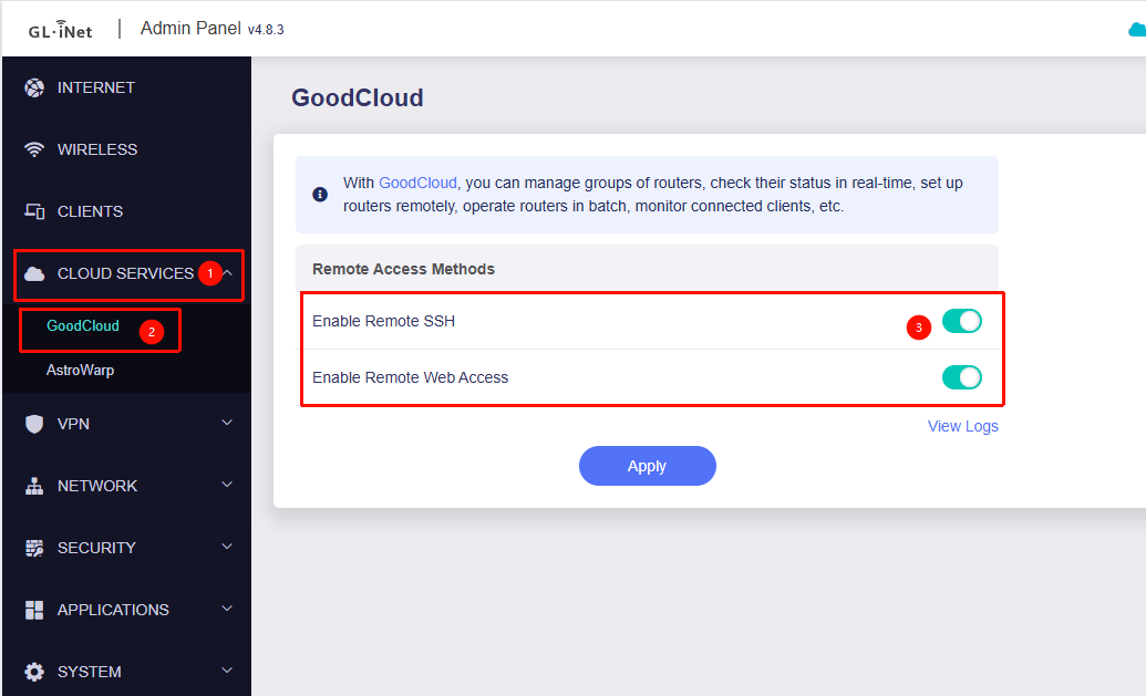 To access the router’s Web UI and SSH via GoodCloud, you need to enable the corresponding options under Admin Panel → Cloud Services → GoodCloud.