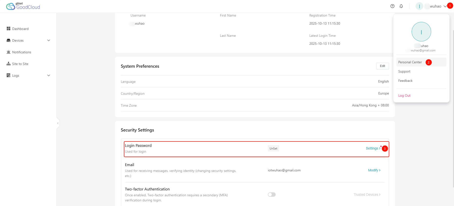 If your account is used to log in to GoodCloud using Google for the first time, after you successfully log in, please go to the personal center and set a login password.