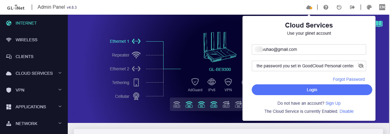 Then log in to the router GL GUI, you can log in and bind your router to your GoodCloud platform with your Google account + the password you just set.