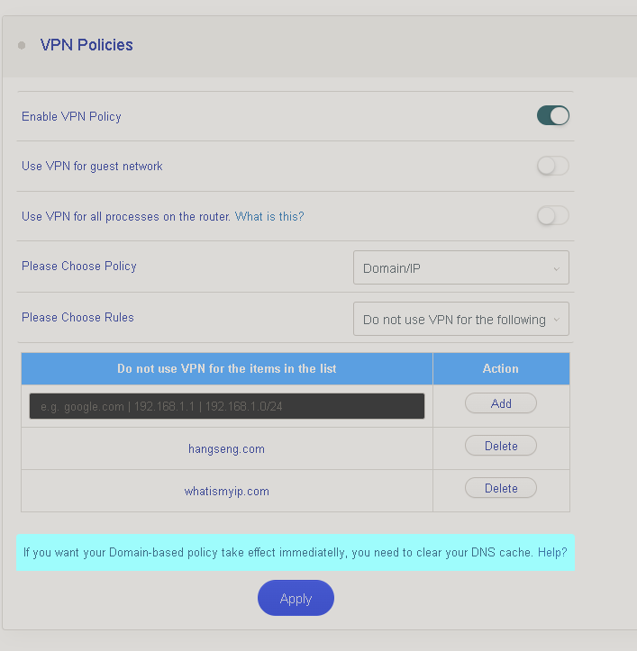 Sorry, I wasn’t clear, you should replace [domianUseVPN] with the domain you want to use the VPN with, e.g. abc.com.