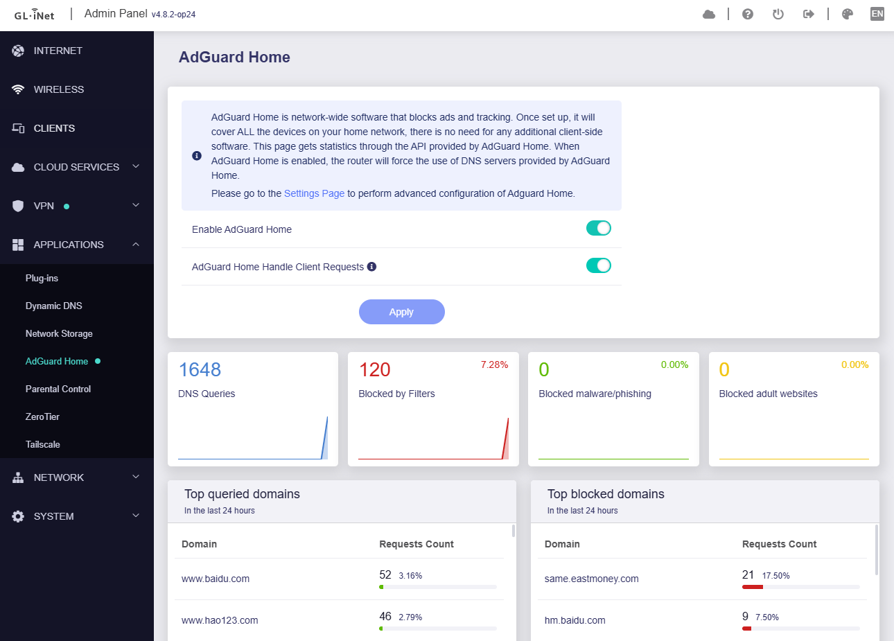 Interesting. 4.8.2-OP24 has been running for ~13 hours and my AdGuard still looks clean … usually there would be XX to YYY queries by now.