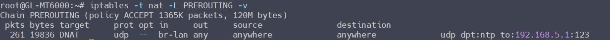 iptables -t nat -A PREROUTING -i br-lan -p udp --dport 123 -j DNAT --to-destination 192.168.8.1:123