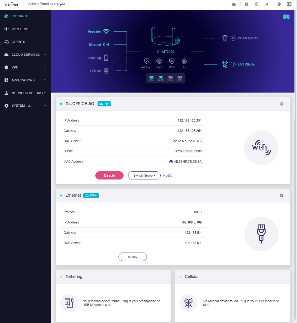 Beryl AX connected to Spitz v2 via Ethernet from the box. I need this because I don't have cable connection (only 4G) and Spitz v2 too weak to work as VPN or network filter alone.