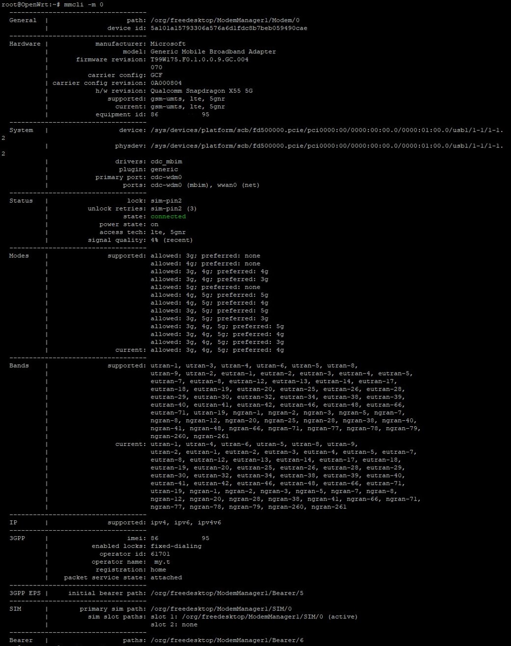 Installed the required packages on OpenWRT. (Context note: I am using a 4G/5G Waveshare board for the Raspberry Pi CM4. This has worked perfectly with my previous SIM7600G-H card. I also tested with and m.2 to usb module)