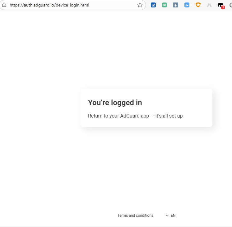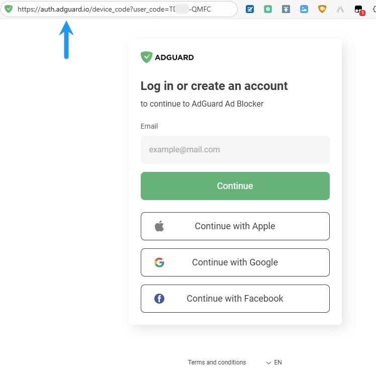 4.2 It will appear a unique URL, for examplehttps://auth.adguard.io/device_code?user_code=****-QMFC, copy the URL and access it in the browser of PC: