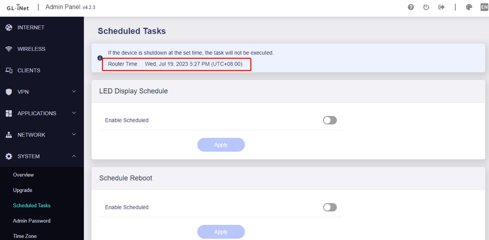2.Enable LED Schedule, choose the time to turn on/off the LED lights and check on the days to perform it in a week. Then click on the Apply button. Noted that it is time triggered, which means the turn on/off action would only be performed at the set time.
