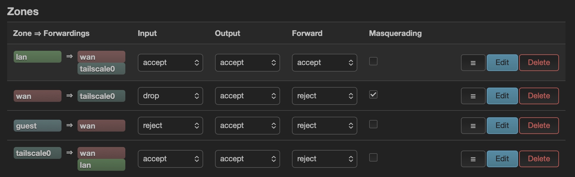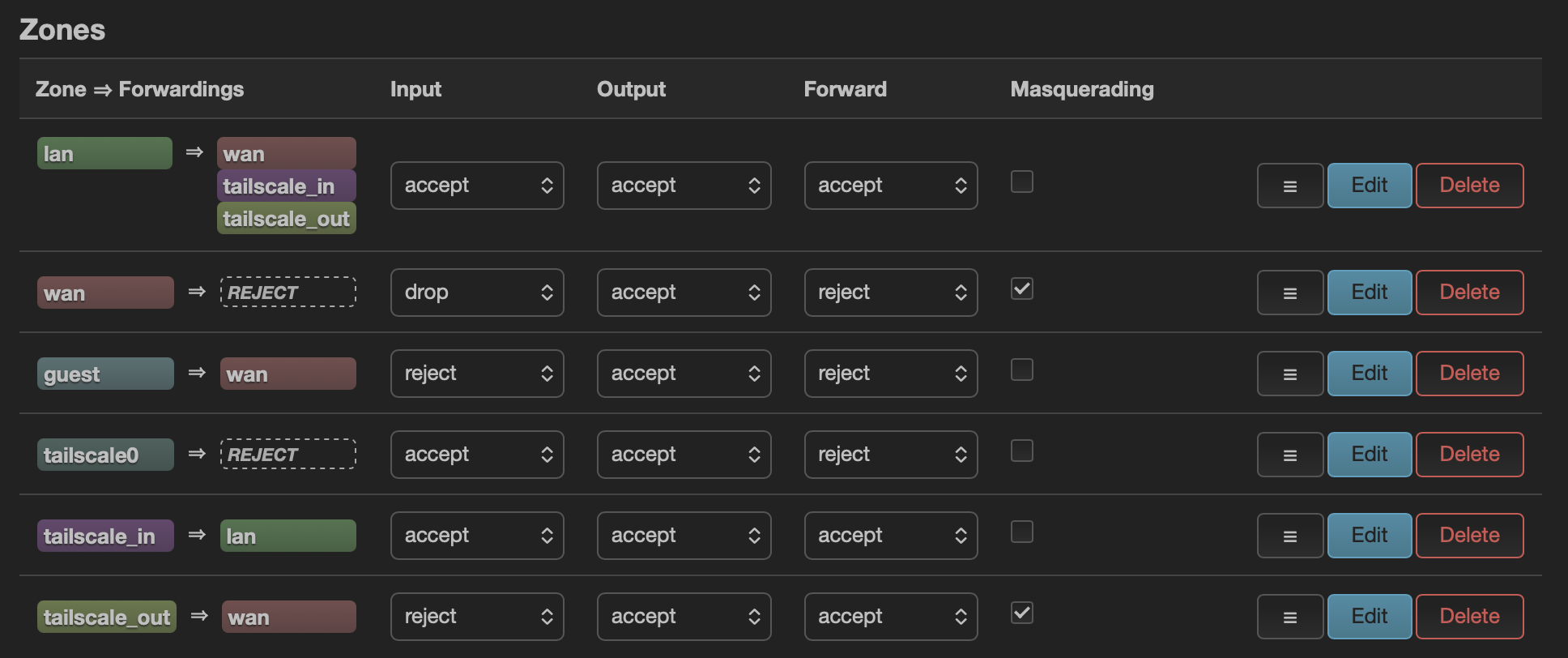 After keep settings and upgrading to v4.8.0-v4.8.3 firmware, Tailscale now has its own dedicated zone, which conflicts with the rules manually added to the WAN zone. Some users have reported that LAN clients are blocked from accessing tailnet, but manually enable masquerade of the tailscale zone (added by firmware) for LAN clients to access normally.