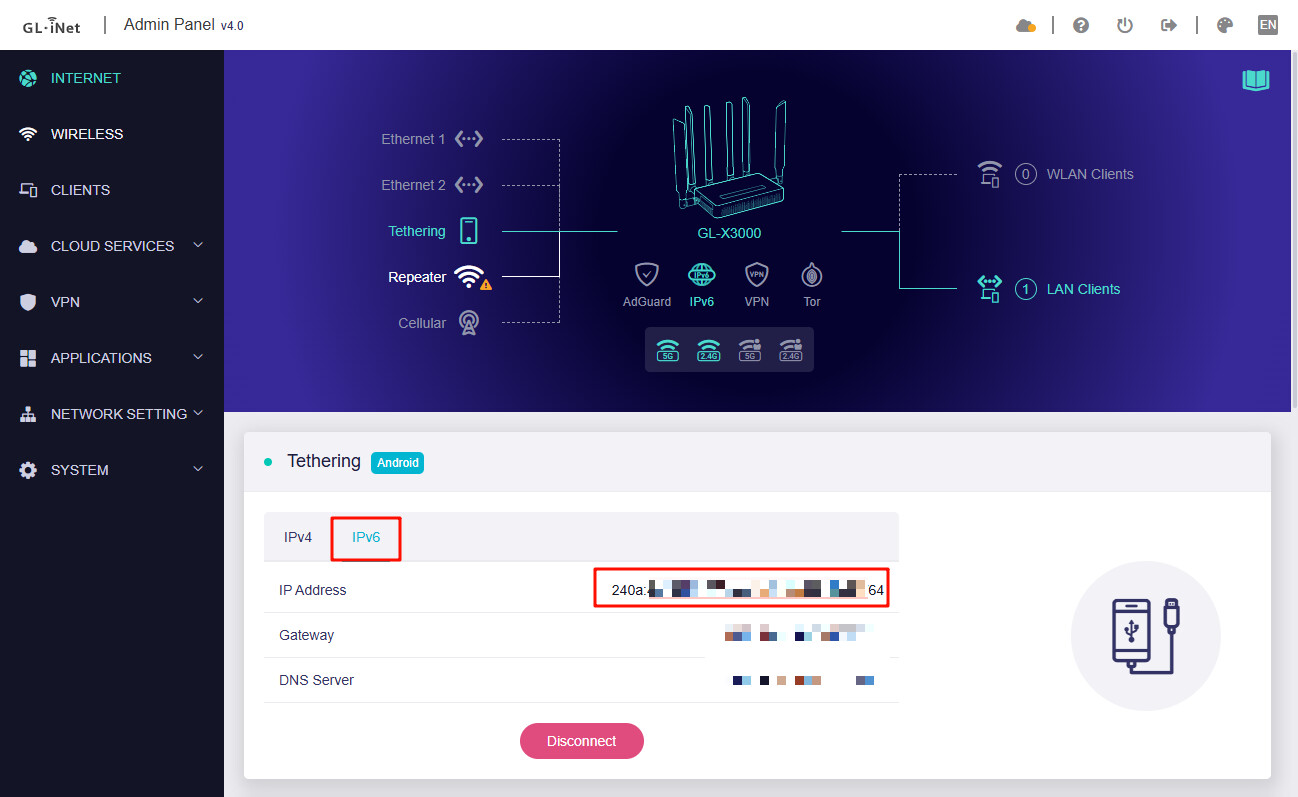 * Connect via GL.inet Wifi + WireGuard (IPV6 Working)