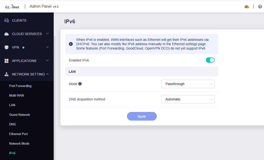 but WireGuard + GL.iNet Wi-Fi = IPv6 works fine.