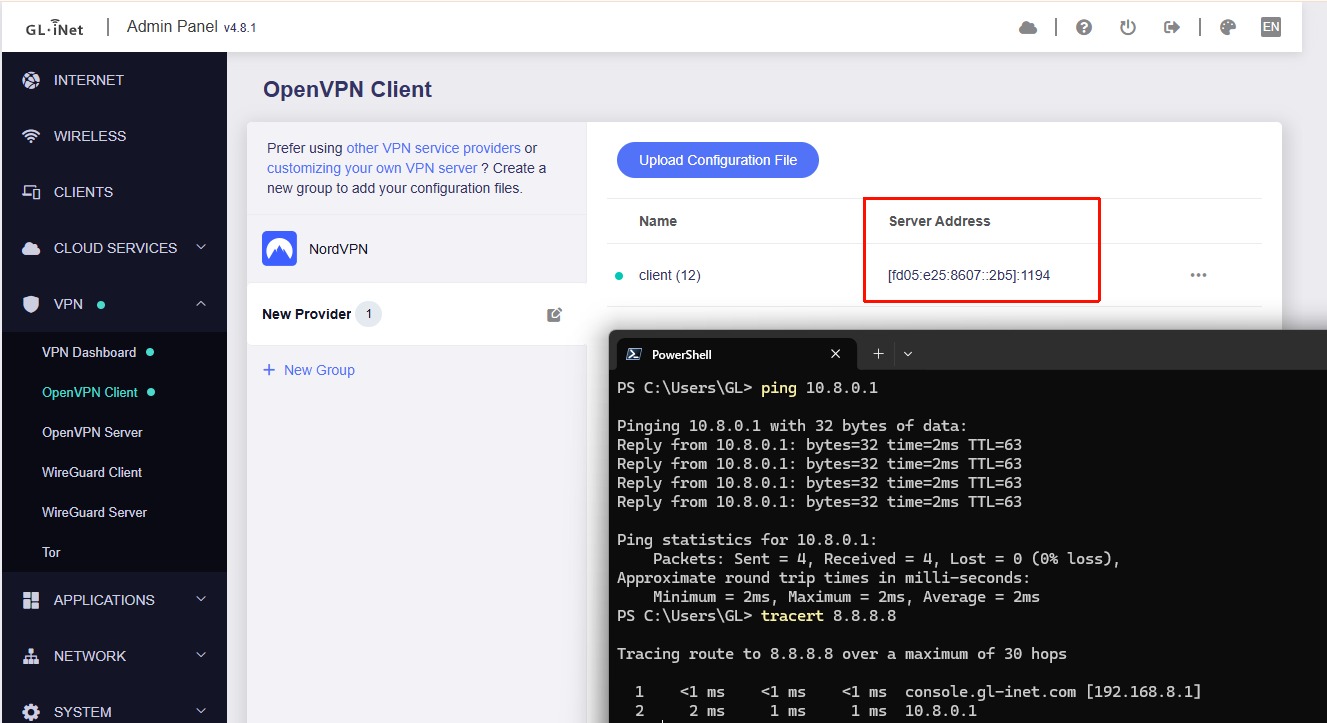 After an OpenVPN ipv6 client session is established on the GL‑MT3000, the tunnel should forward traffic both directions and behave like other clients: LAN to ovpnclient1 to server to Internet, and server to ovpn to LAN. There should be no case where the tunnel connects but becomes completely unreachable for data.