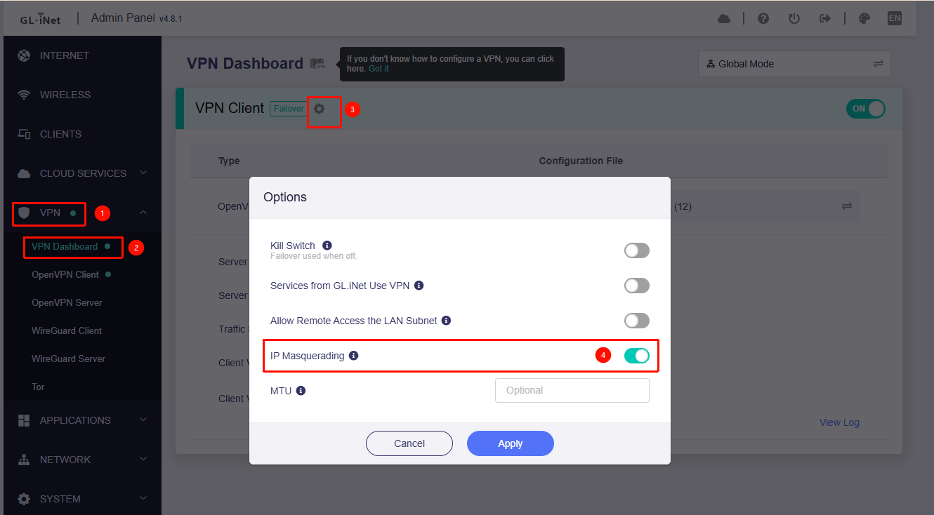 - Enabling or disabling killswitch and changing other settings on the GL‑MT3000 does not restore tunnel forwarding.