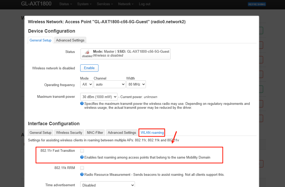 To enable 802.11r, open LuCI > Network > Wireless, click Edit next to the target SSID, and enable 802.11r Fast Transition in the WLAN Roaming section.