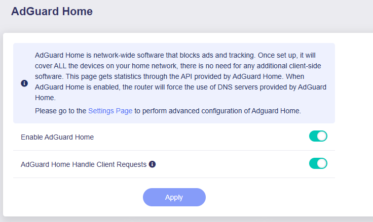 - Applicaton - AdGuard Home, enable the Enable AdGuard Home and AdGuard Home Handle Client Requests to ensure that Beryl AX will forward the unencrypted DNS request to AdGuard Home.