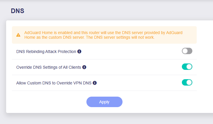 - Admin Panel - Network - DNS, enable Override DNS Settings of All Clients and Allow Custom DNS to Override VPN DNS to ensure that all the unencrypted DNS requests from clients will be handled by the Beryl AX.