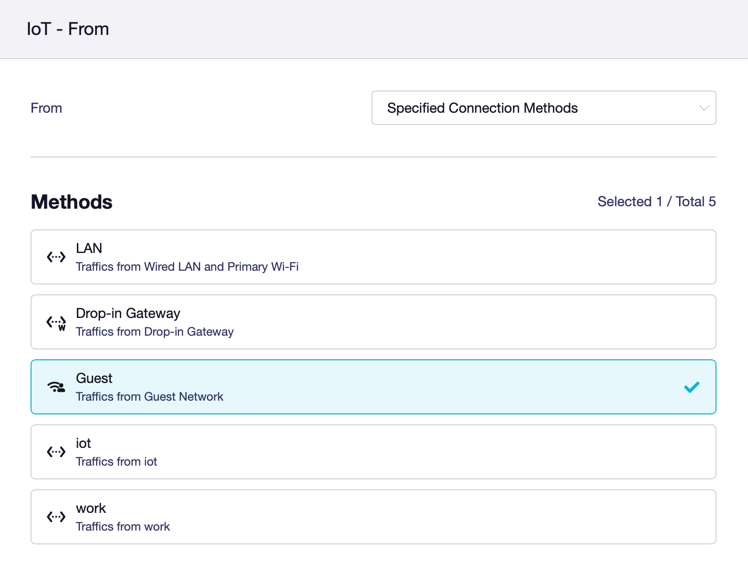 According to your screenshot, if the specified connection methods is selected Guest, so only Guest WiFi will go to VPN, and the others interface/network (like iot or work) will not go to VPN.