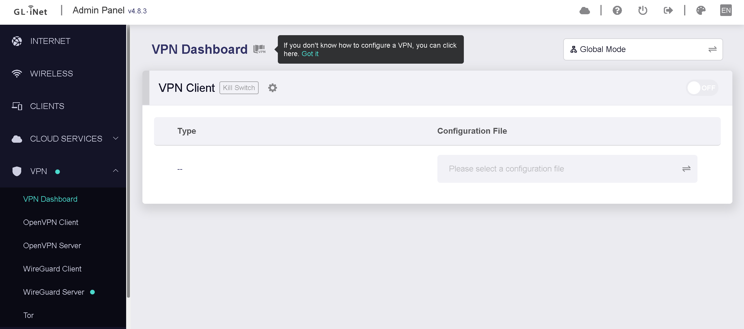 One thing to not is after starting wireguard server I don’t see anything under VPN Dashboard