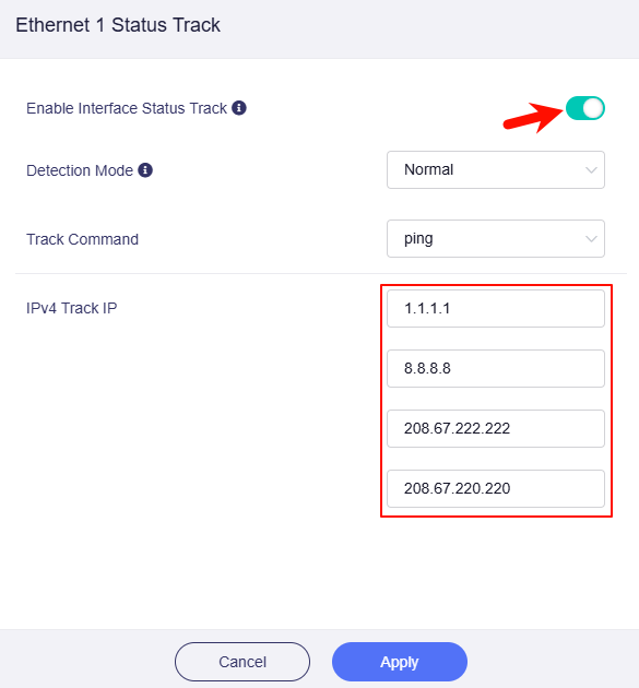 Maybe there is occasional packet loss at some IP addresses, and it is misjudged as an Internet abnormality? -- You can disable the interface status track button, or leave only one address 8.8.8.8 to check: