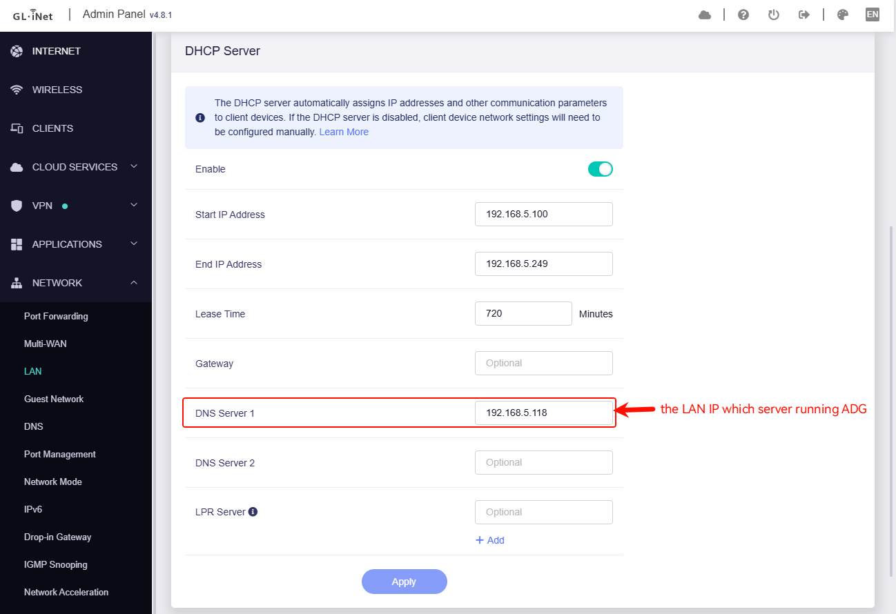Hello, I've installed AdGuardHome in docker using a macvlan and disabled the AdGuardHome on the Glinet router.