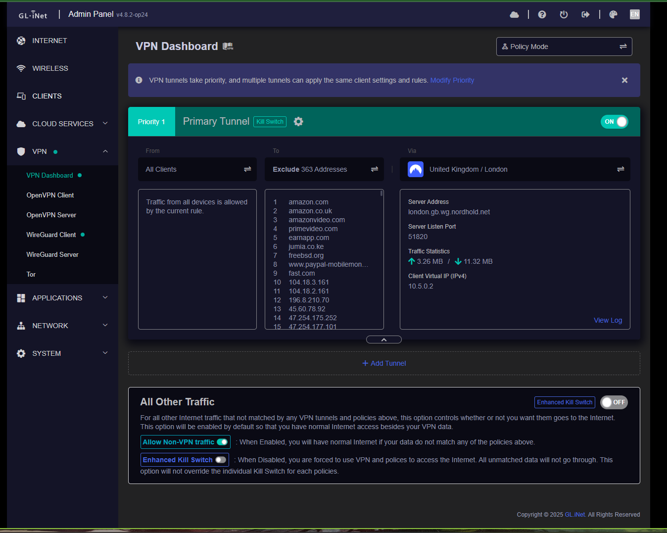 Hosts (by IP or name) in my exclusion list for the Wireguard VPN (to the UK) become simply unreachable.