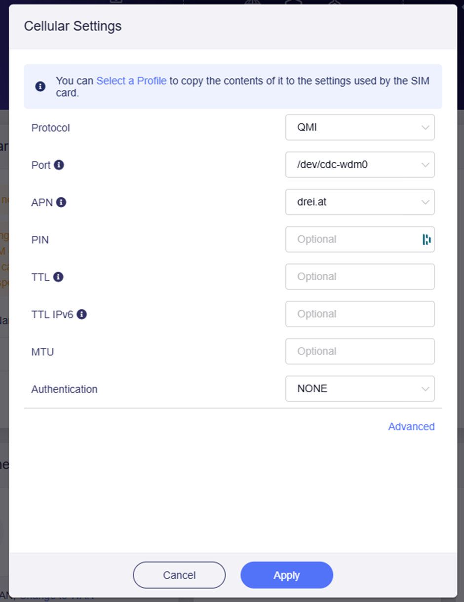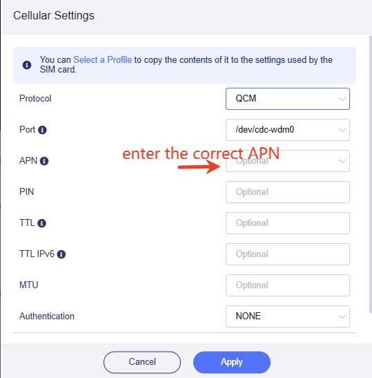 if you couldn't connect sim card via cellular auto setup mode, try cellular manual setup mode. Set protocol to QCM and enter the correct APN, apply to setting to try.