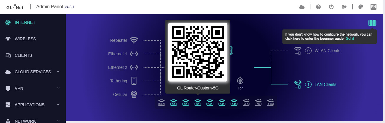 After setting up above mentioned configuration, the additional SSIDs are shown in the GL inet GUI. If all the SSIDs are up, I can see the Guest Wifi, as well as the IOT wifi. The Music-Wifi is not shown on Client devices.