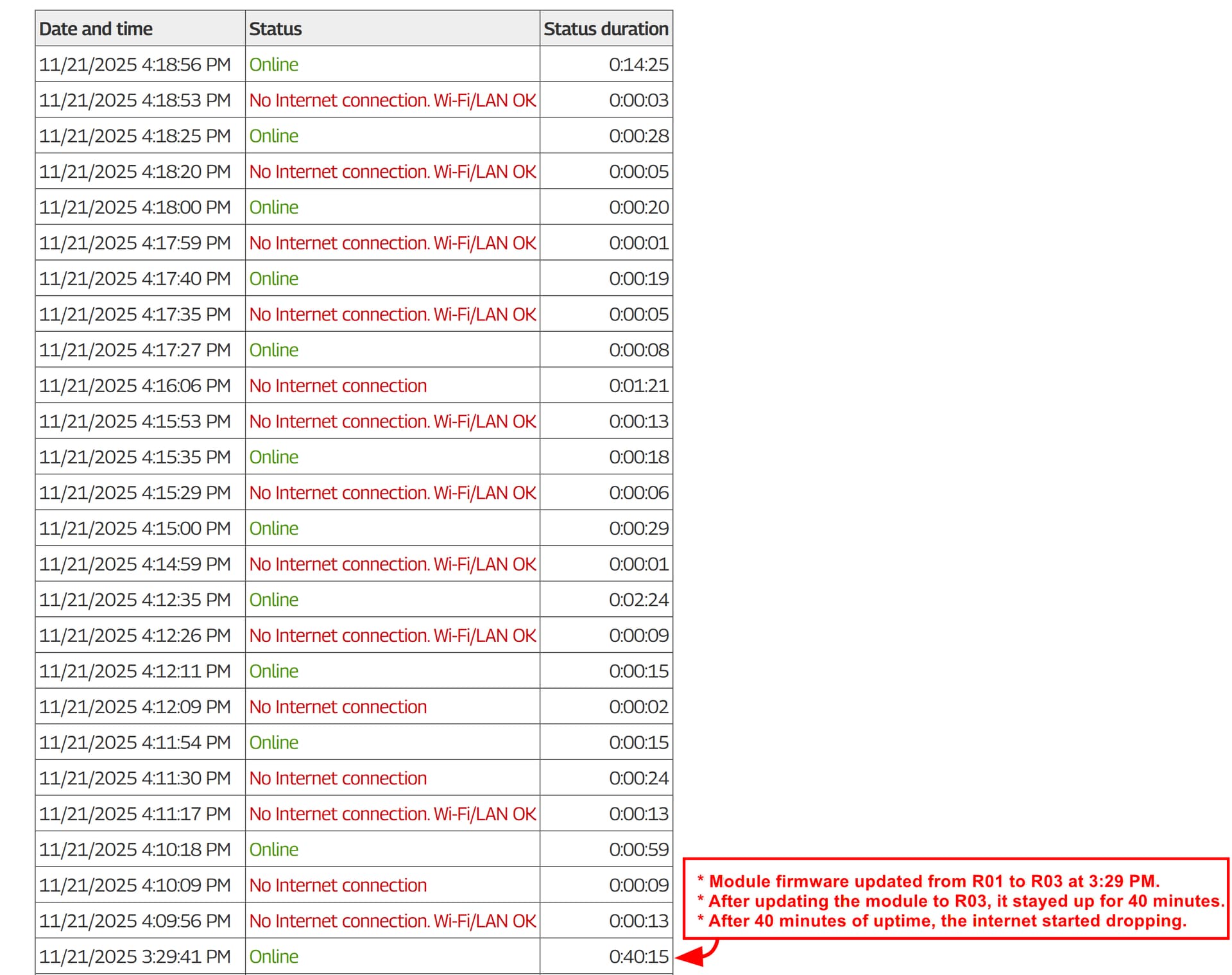 Module firmware updated from R01 to R03 at 3:29 PM.