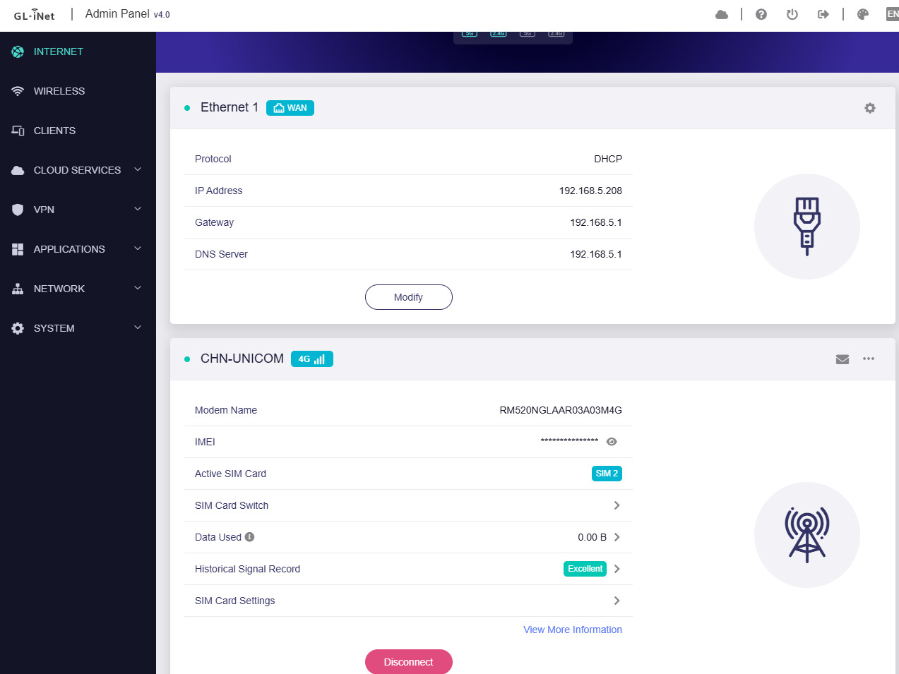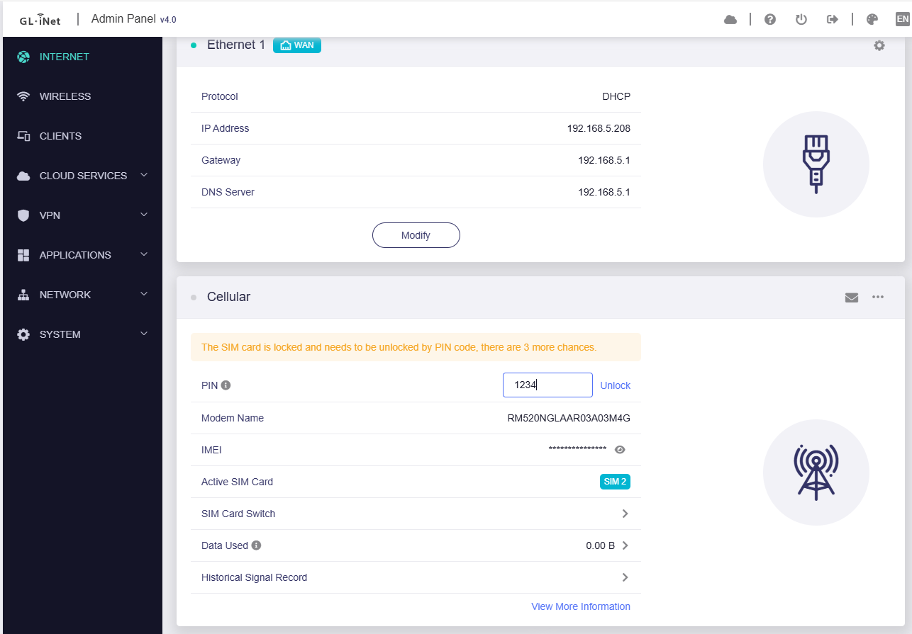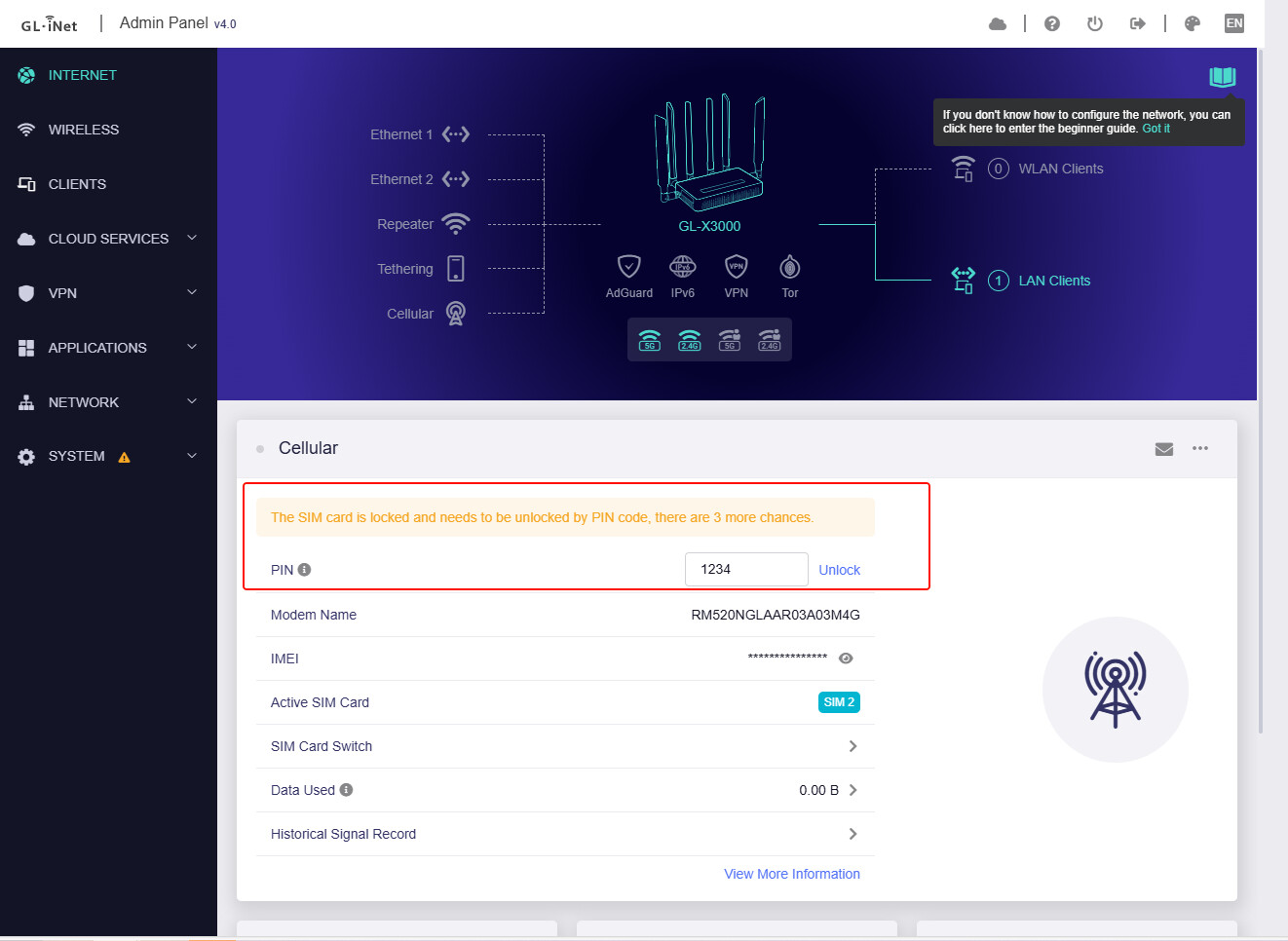 - Restart the router X3000, log in to the GL GUI to check, the SIM card does not need to enter the PIN code again, and automatically connected.