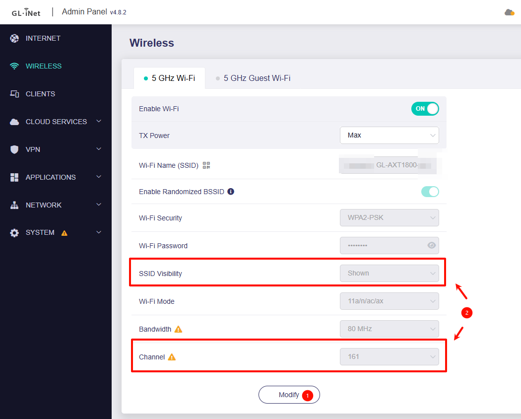 Please note that if the Repeater feature is currently in use and connected to another Wi-Fi network’s 5 GHz channel, you will not be able to adjust the Slate AX main 5 GHz SSID channel setting. You can temporarily disable the Repeater feature for further testing.