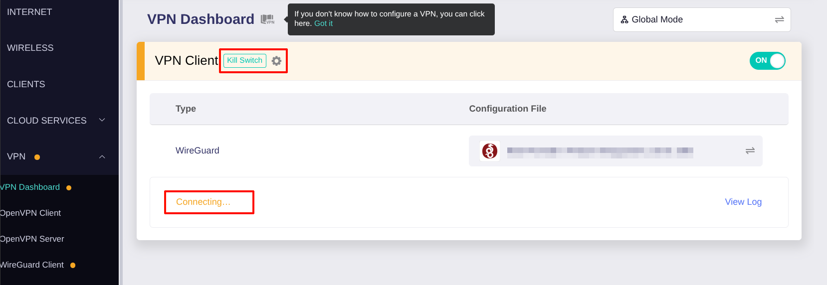 Based on the screenshots you provided, it appears that the router currently has the VPN client feature and the Kill Switch feature enabled, but the VPN client has not successfully connected yet.