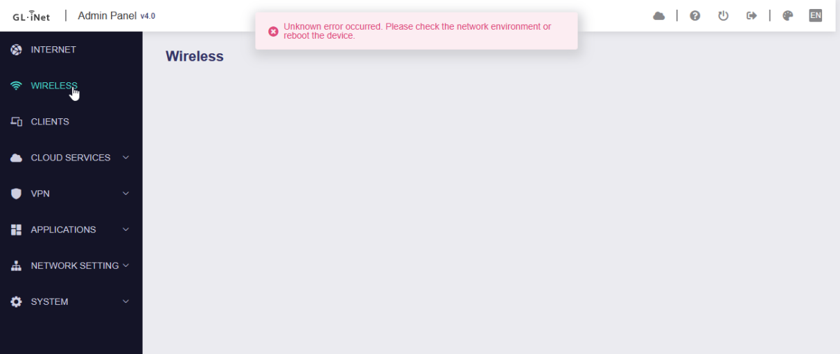 There may be some format or parameter errors in the router's wireless configuration file, causing the UI "WIRELESS" to not display properly.
