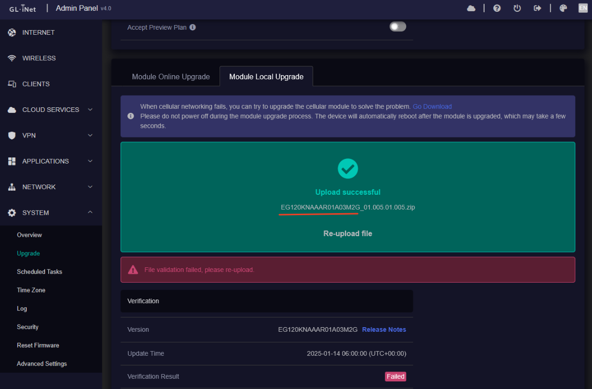 GL-X2000 supports to update the module from the GUI ->Upgrade->Module Local Upgrade