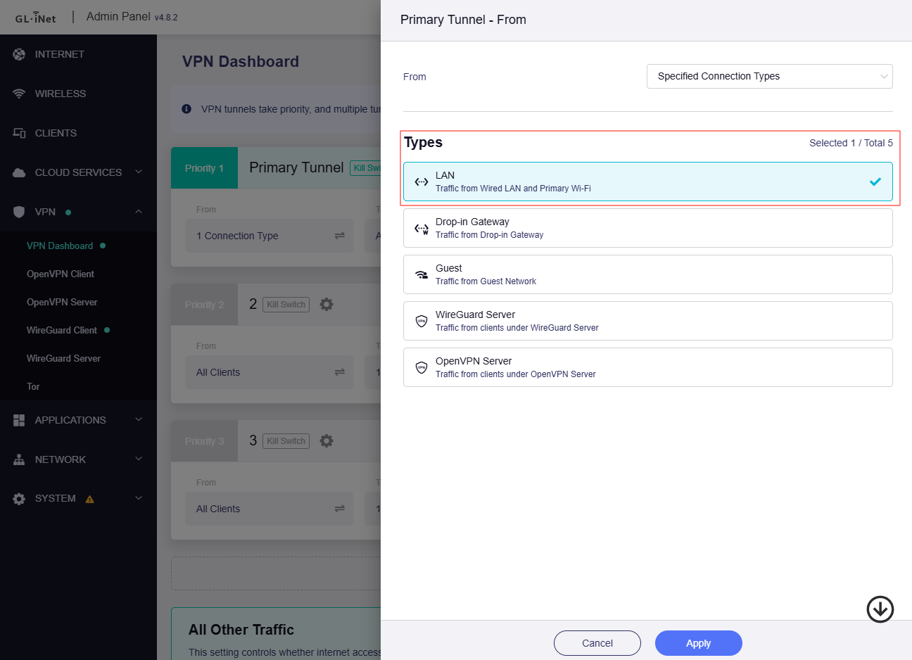 Please confirm whether you have turned off All Other Traffic when setting up tunnel rules.