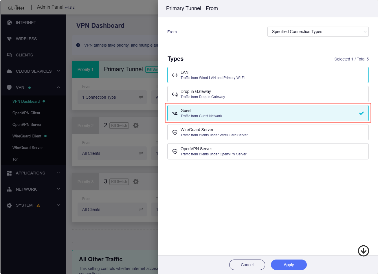 You need to allow traffic from interfaces outside the VPN rules to access the WAN (such as LAN go to VPN in VPN rule, Guest WiFi go to WAN), and you need to enable All Other Traffic.