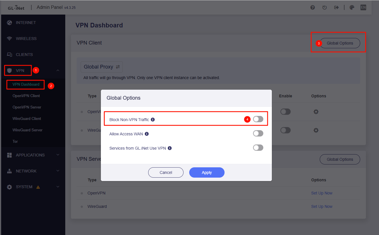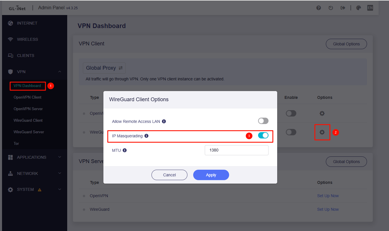 I have been using Surfshark and Azire VPN. I already have a Surfshark account, VPN works flawlessly everywhere and in every equipment I use it, either through the app or conf files. I have created conf files for router in the Surfshark web page and uploaded the conf.bin to the Opal. VPN connects, I get a green dot, but clients connected to router never get Internet, as soon as I disconnect VPN, everything goes back to normal.
