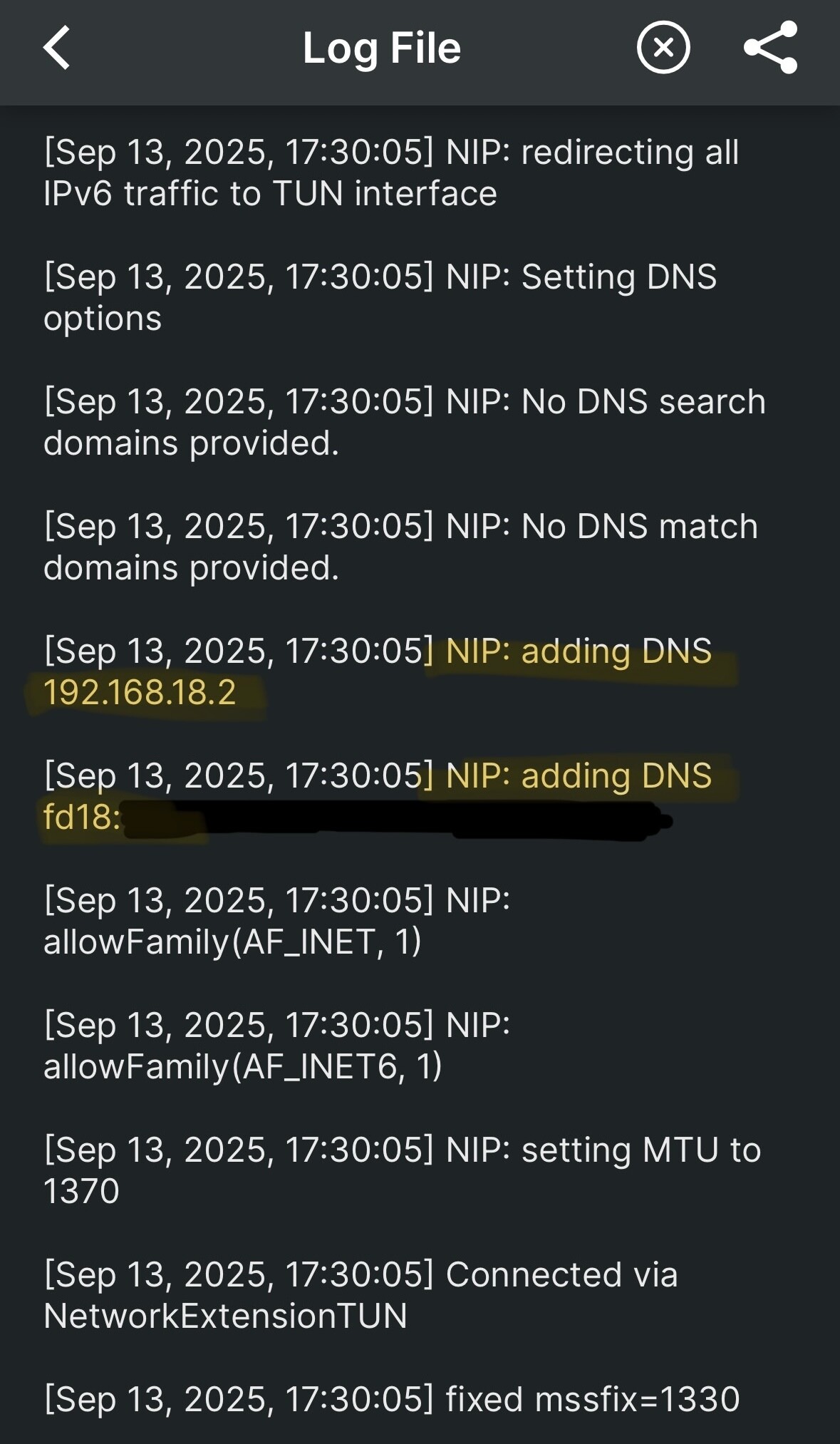 iOS client log – showing the correct behavior with only the two pushed DNS servers.