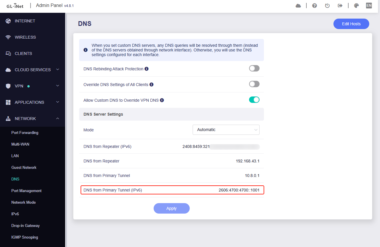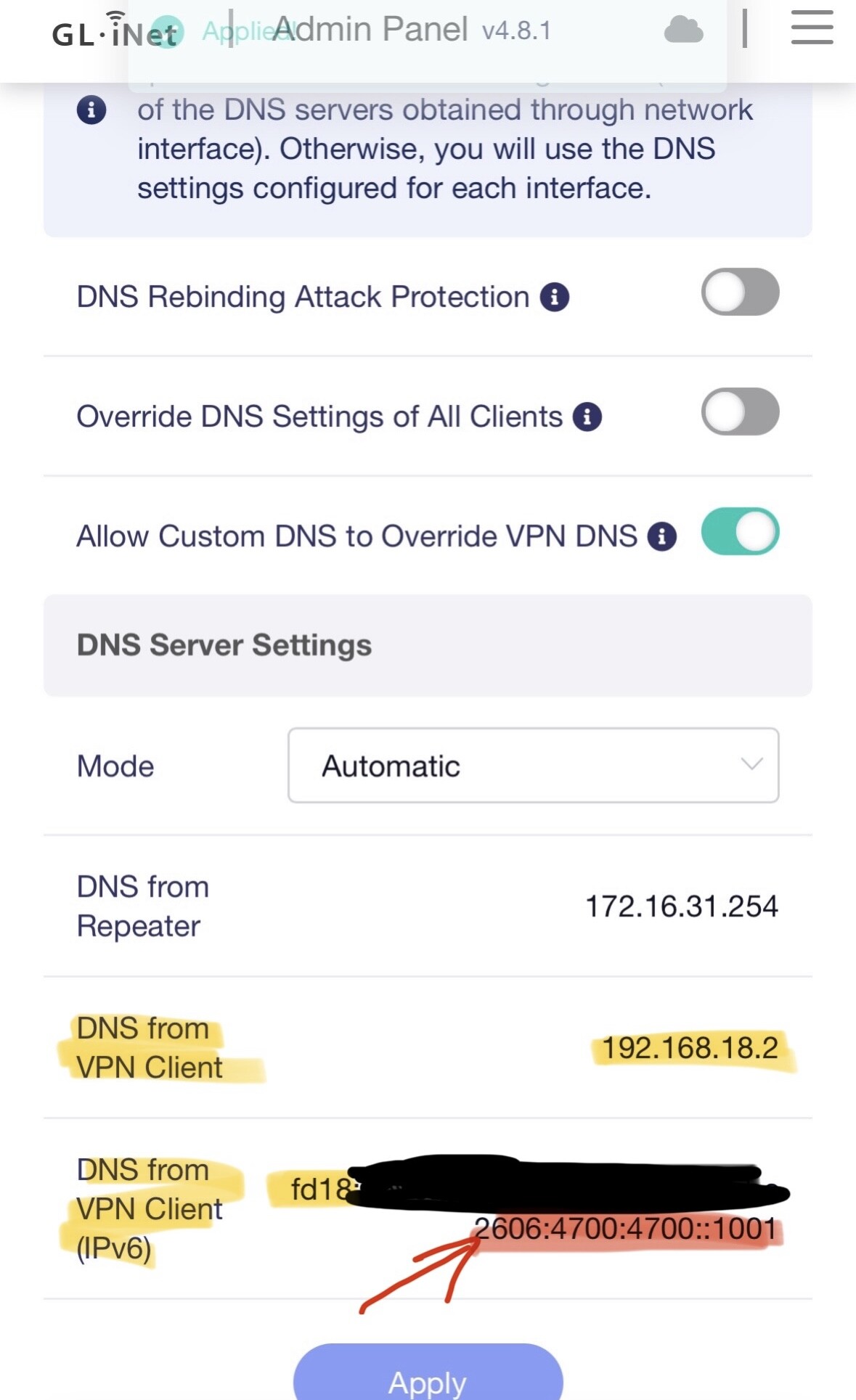 Beryl AX status – showing the two correct DNS plus the unwanted Cloudflare IPv6 address.